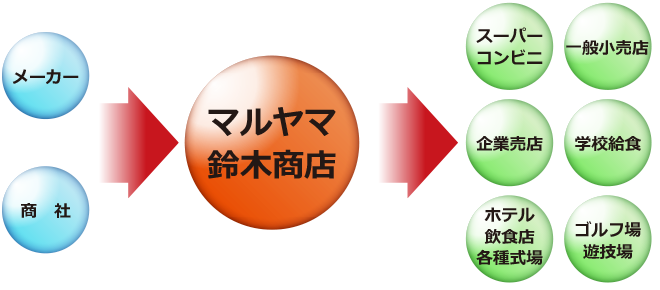 スーパーマーケット、売店等の小売業様の他、学校給食からレストランなど、幅広い業態に向けた、食品・飲料を取り扱っている食品卸売会社です。